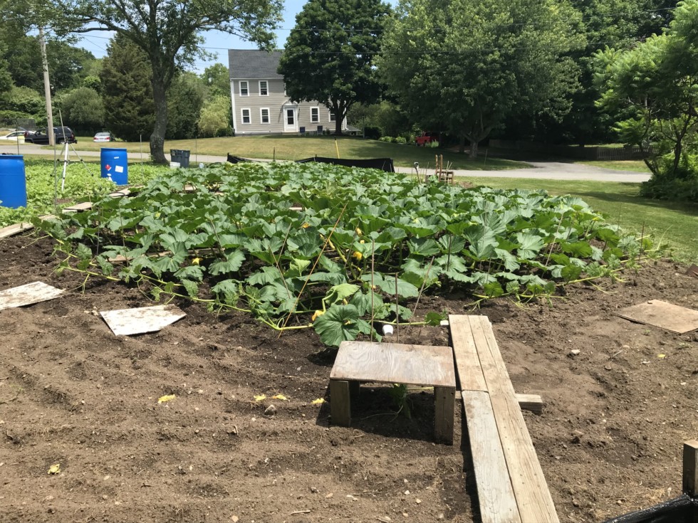 The 1911 Wolf plant is filling out nicely. It has a pumpkin pollinated yesterday at about 16 feet. It wasn't the prettiest girl I've seen by any stretch of the imagination. This seems to be a problem this year on both plants. A lot of nowhere near perfect flowers. I have one more shot on the mains of both plants for a June pollination. A little late in the day, but they are way out on the vines with massive plants behind them. I�m of the opinion that a late pollination with a good flower is the better option. The nearest is a day away, and the other, at least two.