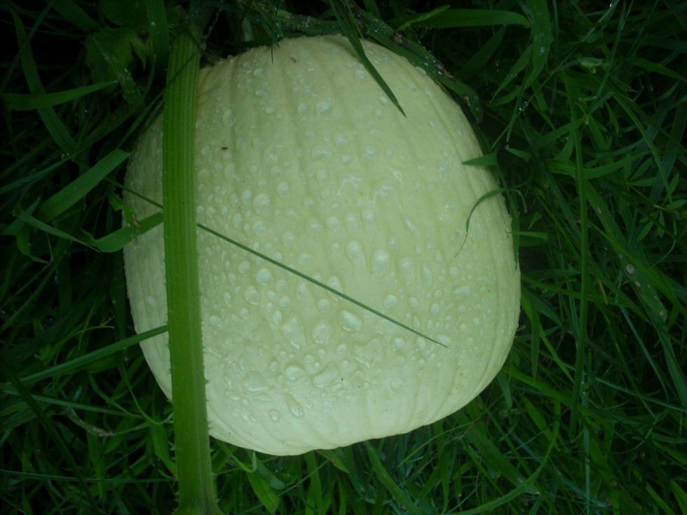 This is a volunteer field pumpkin that came up in the yard. I have been mowing around it. Crazy color Huh?