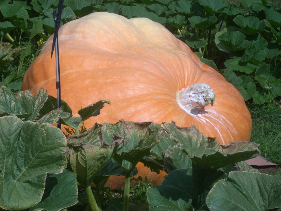 Another shot of the ugly shaped pumpkin. It was destined to grow over the blossom end right away. I didn't really try to fight it. One thing I do regret though is using a light blocking tarp as a cover. You see that white spot, well that is because zero filtered sun reached that location. Even a white sheet allows some sun through. The best colored pumpkins I have grown were when I used a thin burlap shelter built over the pumpkin. It allows a nice filtered light throughout the day.