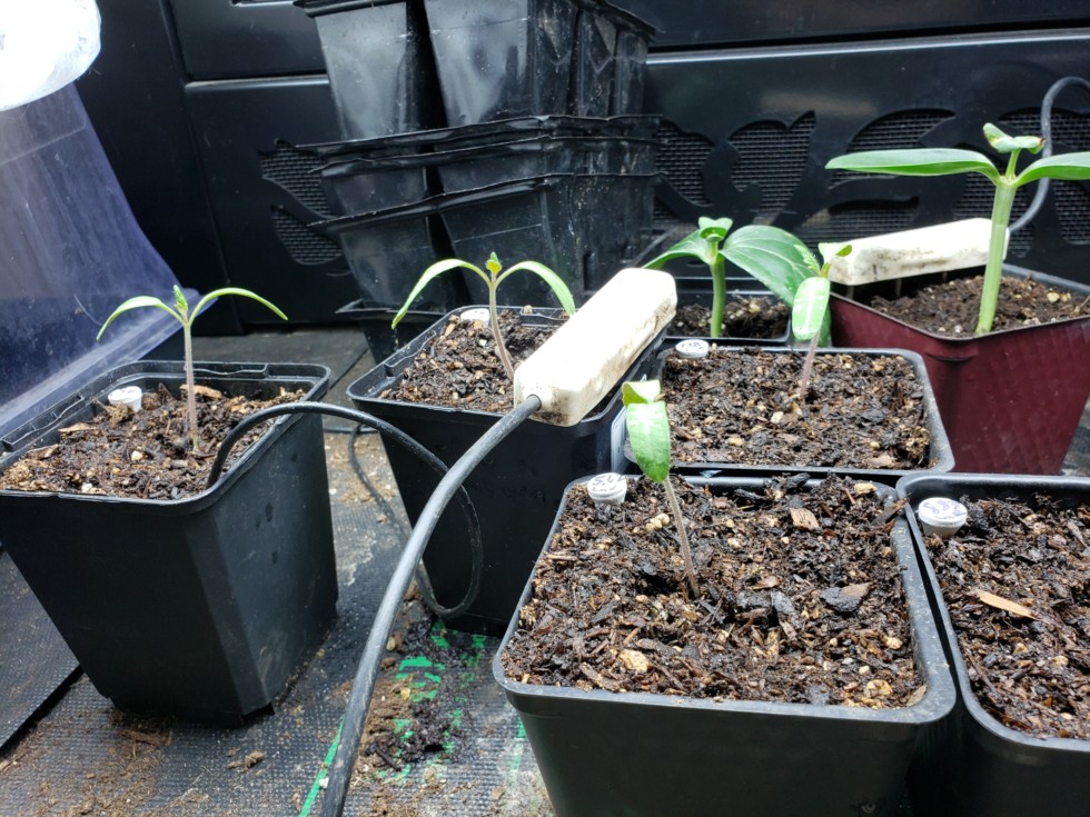 Round 1 of the tomatoes are 2 weeks since planting. In the background are a couple practice watermelon grafts. I'll be greenhouse growing big tomatoes again this year, like I did year before last. They're going to have quite the elaborate setup.