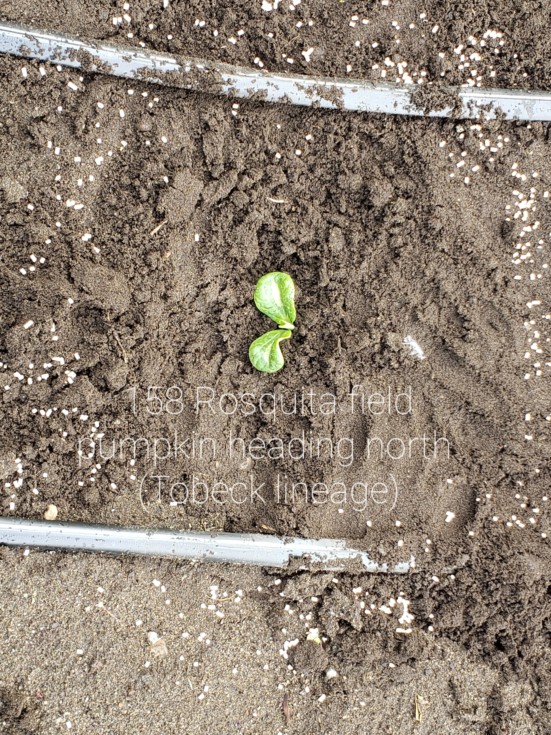 This is an older field pumpkin seed that I chose because it came from one of my own seeds: 157.5 Rosquita UOW (117.5 Tobeck x open). The 117 Tobeck was an unassuming small, round ball with a very long, cool stem that went WAY heavy. In fact it barely had a cavity at all! So I'll be the first to grow this old one, and hopefully I can get my 2013 state record back!
