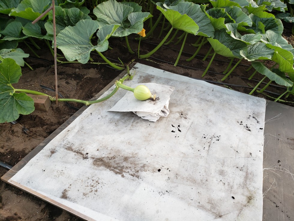 I totally flipped the main vine around, removed some secondaries and got the squash to lay down on a 5x5 sheet of plywood and mill fabric. I'll add a bed of sand tomorrow.