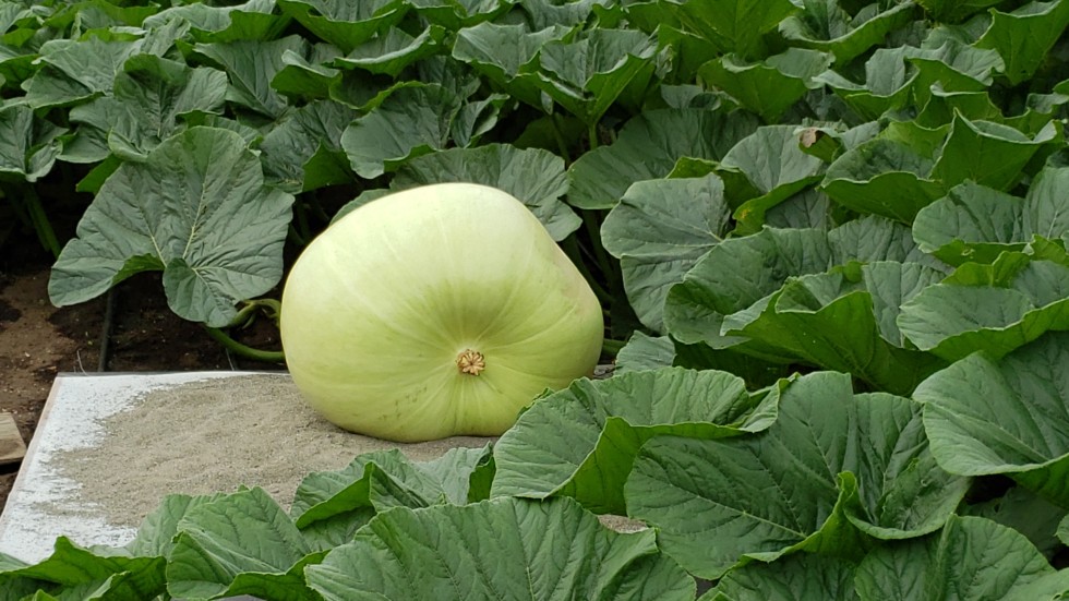 1935 Jutras squash is a pretty light green. That sunburned side is all cantalouped up and flat. Lesson learned. Ultra healthy plant