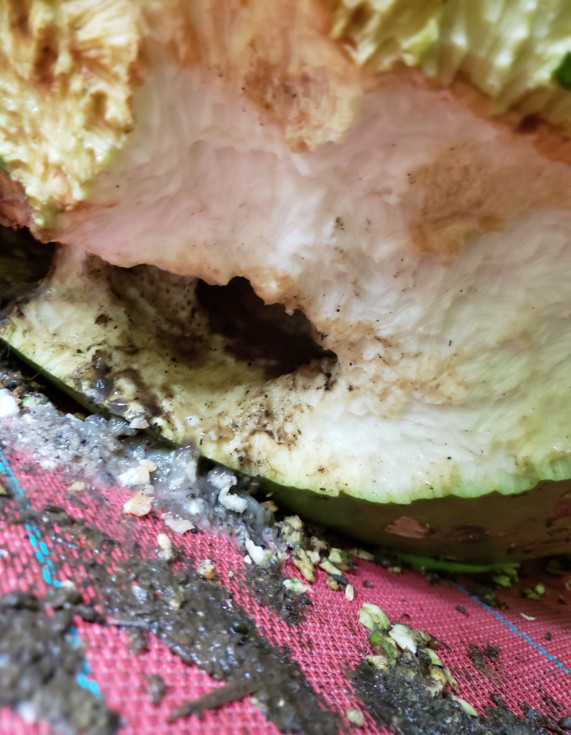 Ughhhhhh...measuring my massive bushel gourd and my hand got wet. I peeked behind it, and the stupid mice gnawed right into it!