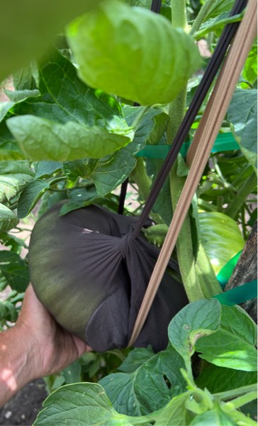 Fred flashed this morn..I�m touching the bottom middle of the fruit. Gonna let go as ripe as I can. Big fat red heavy slob.