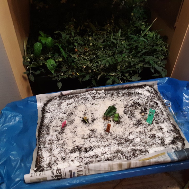 It took 4 of the orange pots to fill this tray, which are nominal 1 gallon size but I think they only hold a half gallon, so about 2 gallons of dirt. Next year I could try a bigger tray but I'm not sure how much that would really help grow a bigger pumpkin, since a really large plant really early would quickly be subject to half a dozen or so other limiting factors.