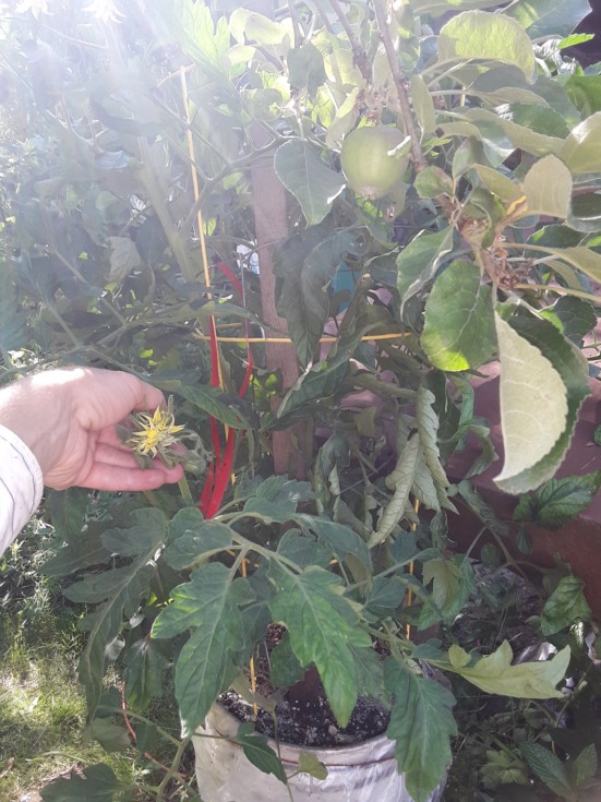 5 gallon bucket beauty. This plant is getting big and thirsty, this blossom is on the lowest lateral branch. Probably will do ok with a gallon a day of water, if I can remember.