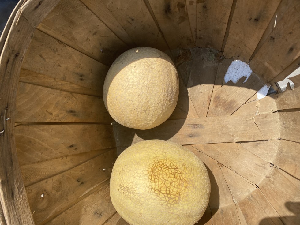Getting a few muskmelons these are culls. Too much rain caused them to ripen prematurely. They will go to the cow and chickens