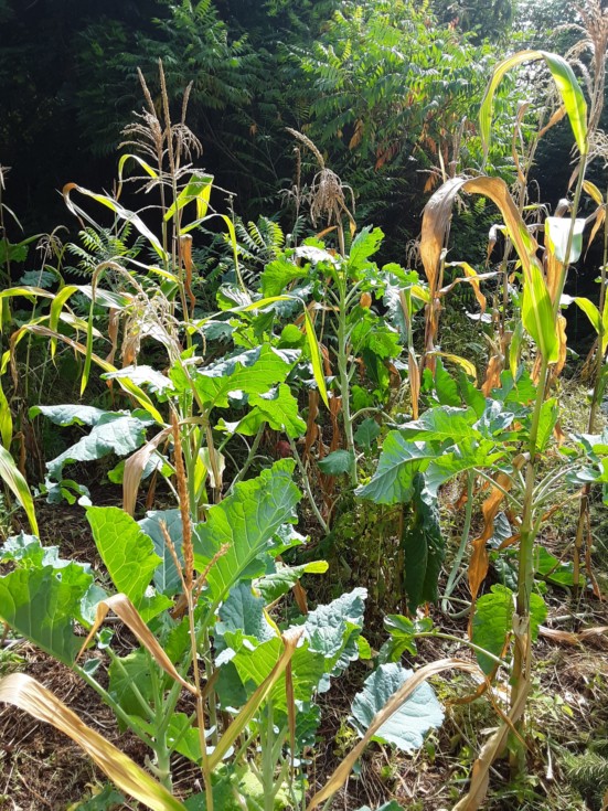 Corn and giant kale got along well enough. There were potatoes companion planted in here too. A triple combination that worked, which is rare. The Pacific Northwest "three sisters" is corn, kale, and potatoes, ha ha. In my garden, the traditional three sisters, beans, squash and corn... they don't get along very well.