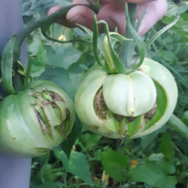 This time, in 3 out of 3 cases, it occured on the sunny SW side of the tomato, so maybe heat or sun, is a factor also. But I dont think that was a cofactor earlier this year, when they were growing in the protected hut... maybe it was, I dont remember.