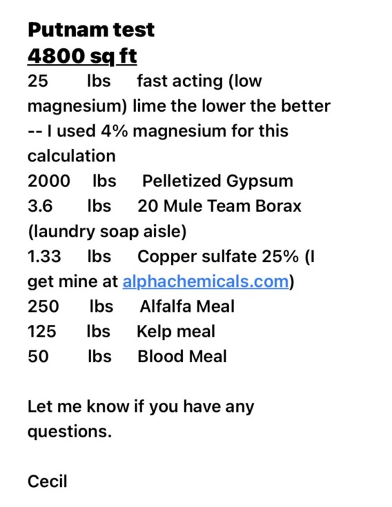 I am a big believer in the Langley Soil Calculator. For the last 8 years or so I have sent my soil test results to Cecil Weston & he has run them through the calculator for me. I have had great success in the years when I have closely followed his recommendations for amendments. Here are his recommendations for the Putnam Patch.