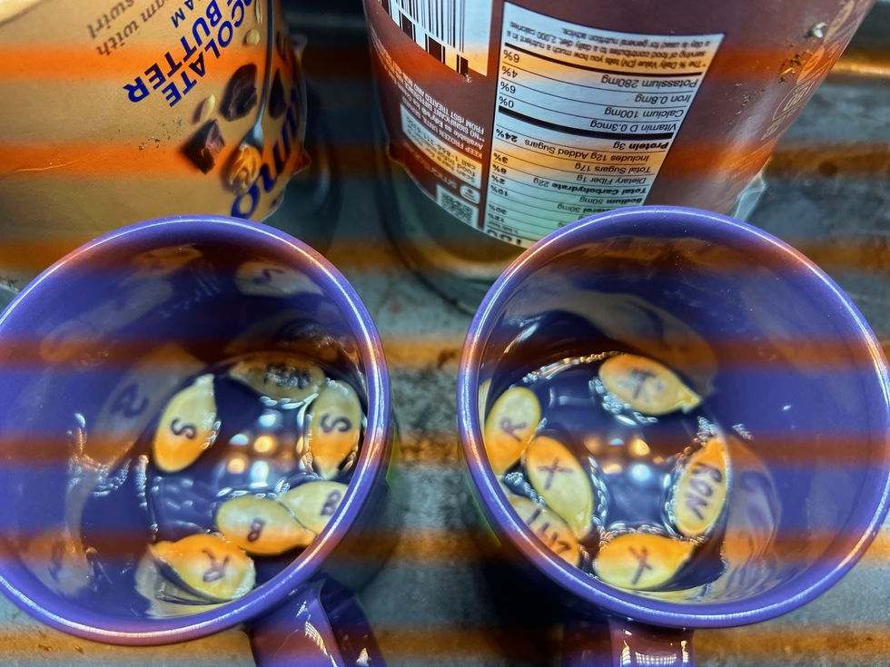 This morning I'm soaking my seeds in water with a little peroxide. I split them into 2 groups: thin/white seeds & thick/tan seeds. The white ones will soak for a couple hours & the tan ones will get another hour or two. I have them all marked for easy identification. I like to mark them mainly with letters rather than numbers (weights). After a few days of being moist 3's, 6's, & 8's, and 1's & 7's can look a lot alike!