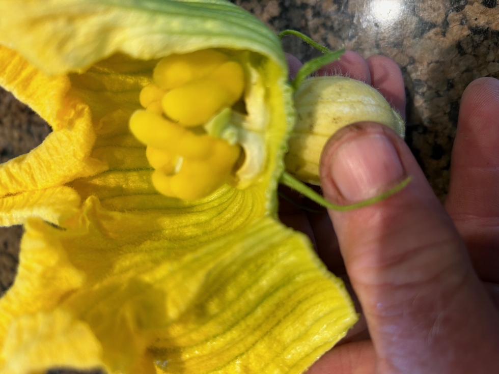 I pollinated some back-ups this morning & found this female with seeds in the blossom. If you've never seen one of these before, now you have! Personally, I would only grow a female like this as a last resort; you will end up with a pumpkin with a super-thin blossom end that is likely to end up with a blossom end split.