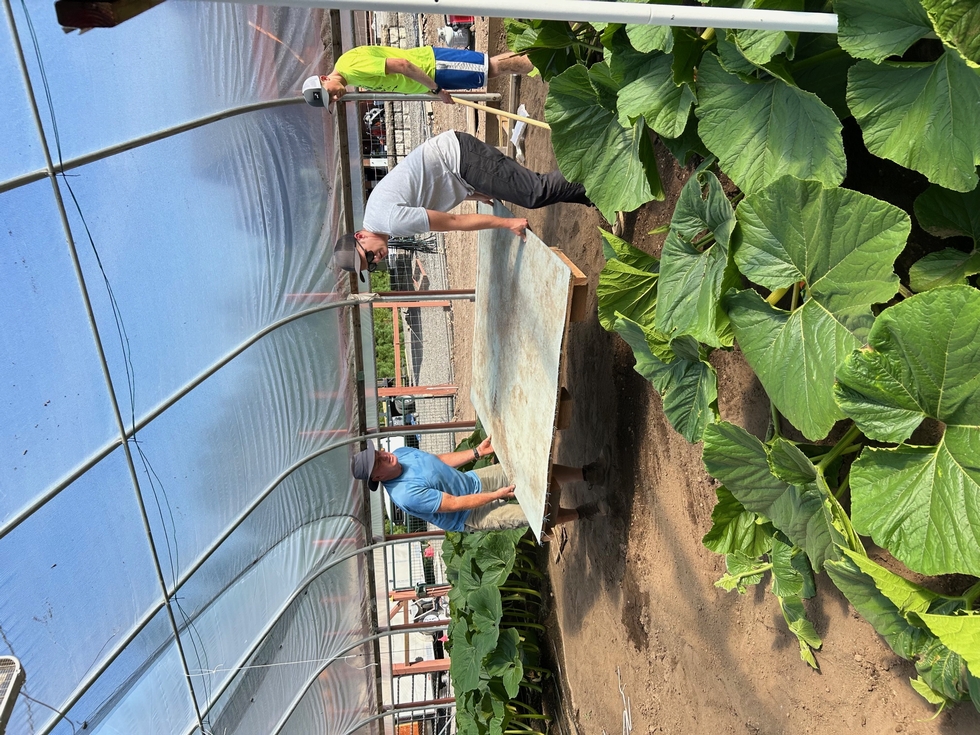 We built 5'x5' raised platforms to grow the pumpkins on. Someone who is smarter than me figured out that by growing fruit off the ground that the blossom end is less likely to disappear under the fruit as it grows and potentially lead to season ending problems. The theory is that the ground temperature generally is colder than the temperature of the air. This causes the portion of the fruit which is in contact with the ground to grow slower than the rest of the fruit�causing the blossom end to roll under. It makes sense, so we built some platforms to give it a try.