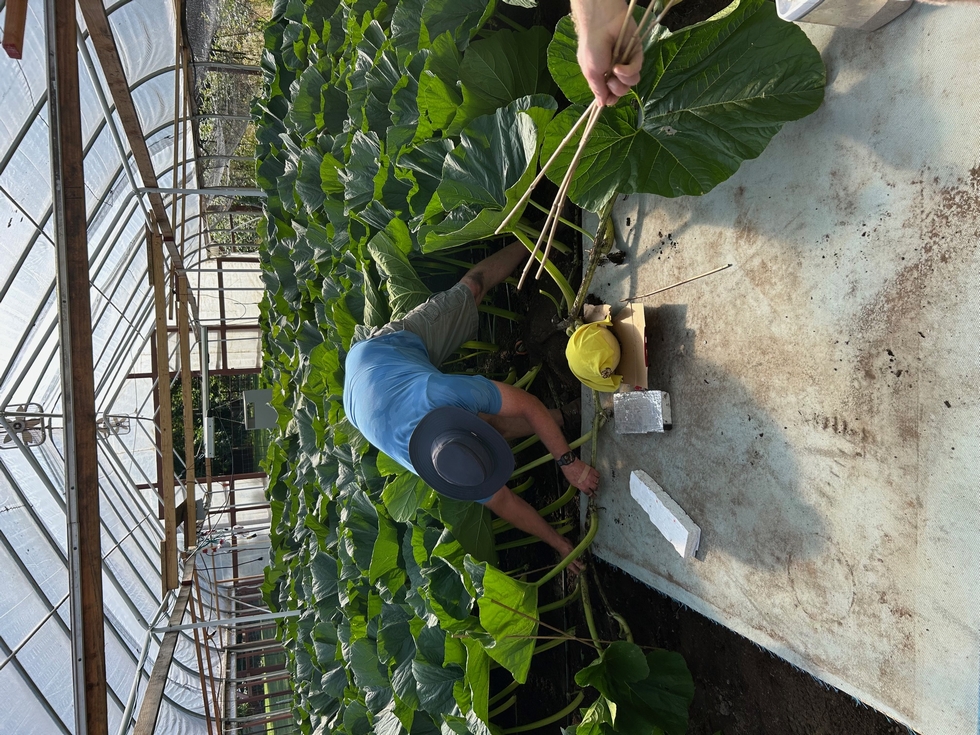 I like to align the fruit with the main vine as it comes away from the plant. Where the fruit, the main vine, & the secondary vine at the fruit all come together I move the main one lateral direction - the secondary the other lateral direction - and the fruit straight ahead. I have ramped up the main vine with soil as it leads up to the platform. Now it's time to grow some fruit! Hold onto your hat!!!