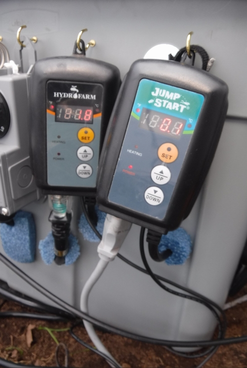 The image may be slightly out of focus and the values can be read, but the key is the application of these two controllers. The �Jump Start� one on the right has the temperature sensor about 8� below ground to get a reading of the root zone temperature. This is typically set for 70F (21C) and takes about three days to reach this temperature, after this time it just needs to maintain this heat. As a result, this is set-up ahead of the plant going in the ground as a way to check to make sure things is working properly and to ensure the seedling can start growing from day one of transplanting.