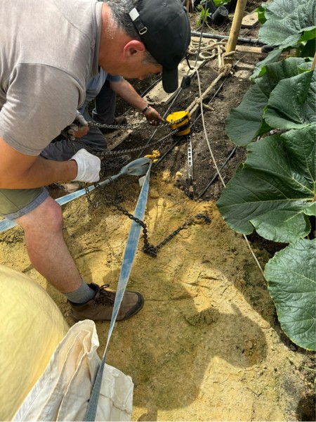 This was a first for me and I had to get some of our staff to help. The White Jacobus was growing back on its stem so we winched the pumpkin forward and it worked okay.