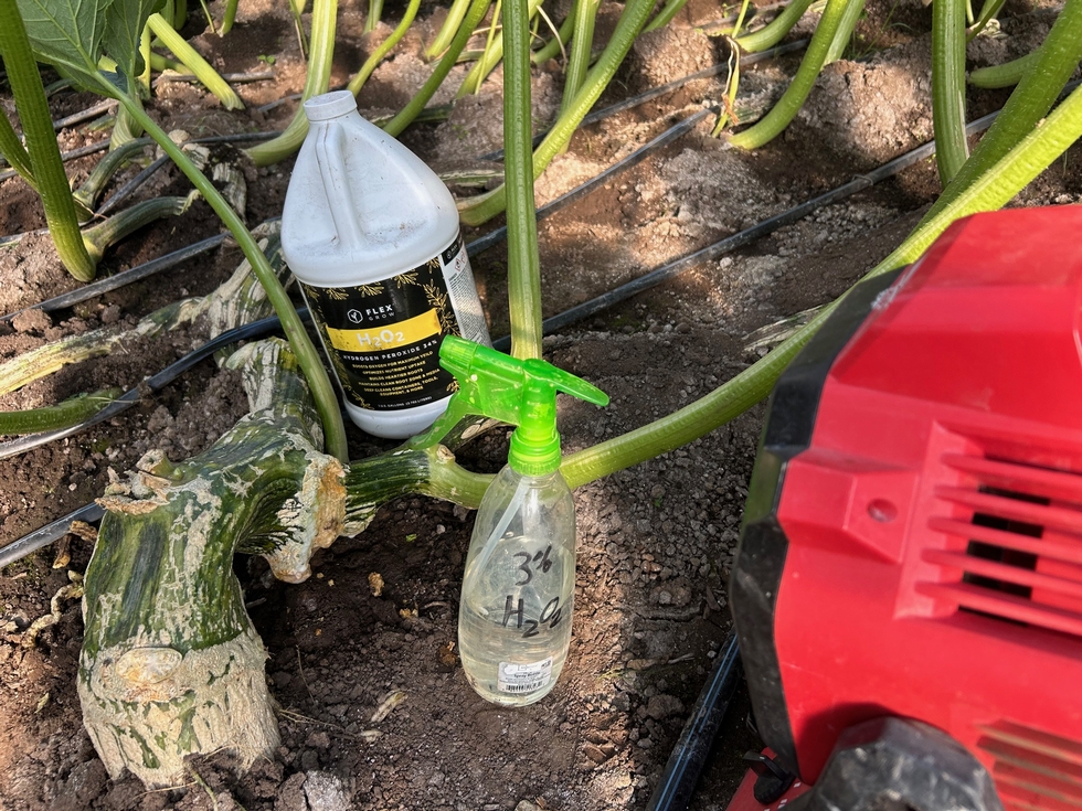 Happy Independence Day everyone! I'm celebrating by giving my basal crowns (back in Kansas where I grew up we would have called them stumps) some much needed attention. I had all sorts of new vines starting to grow & broken old leaves starting to rot. I cut them all off & did one of my favorite pumpkin growing jobs: I sprayed the places where I cut them off the vine with Hydrogen Peroxide. It wasn't your household 3% solution either. It was 34%-spray it on the bad spot & watch it foam up hydrogen peroxide! It was almost as much fun as putting salt on a slug. Then I put a fan on the cleaned up wounds. In few hours everything will be dry & ready for the next three months.