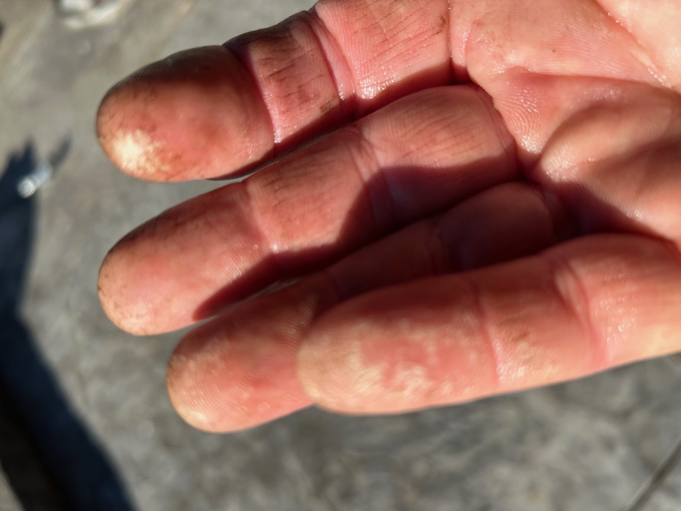 Here at Vineman's diary we do our best to keep you from making the same stupid mistakes I always seem to make. This is what your hands will look like if you get 34% hydrogen peroxide on them! I poured it out of the gallon jug into my spray bottle & put the lid back on the jug. My mistake was is picking up the jug without rinsing it off. Smart guys like Jim Sherwood & Jim Ford would never make a mistake like this.