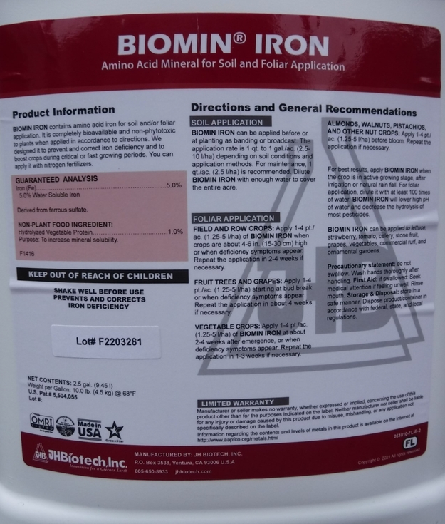 While there are many different types of Iron fertilizers the Biomin line uses and amino acid to help increase the amount of the nutrient that is plant available. For many of the micronutrients this is important as they are needed in small amounts but can often be a challenge to get the plant to uptake. Having this form allows for directed applications to be readily absorbed by the plant to help reduce the duration of a deficiency.