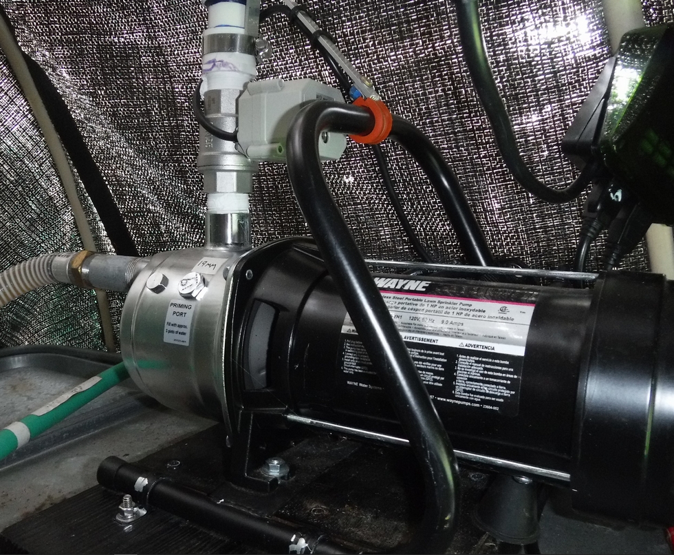 Above the tank is a BACO-ENG 1� Electrical Ball Valve that is normally closed and when power is added it will open. This had to be added since even though the pump would turn off, slowly over the day water would syphon out and over water the plants.