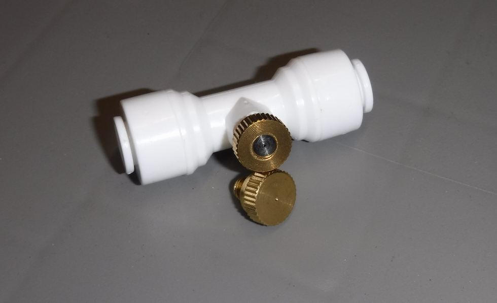 While the white fitting is the actual misting nozzle and is important, do not underestimate the importance of the brass plugs as well. The set-up around the plant will be shown and it is recommended on the initial installation to run all of the nozzles to get an idea of the maximum distribution of mist.