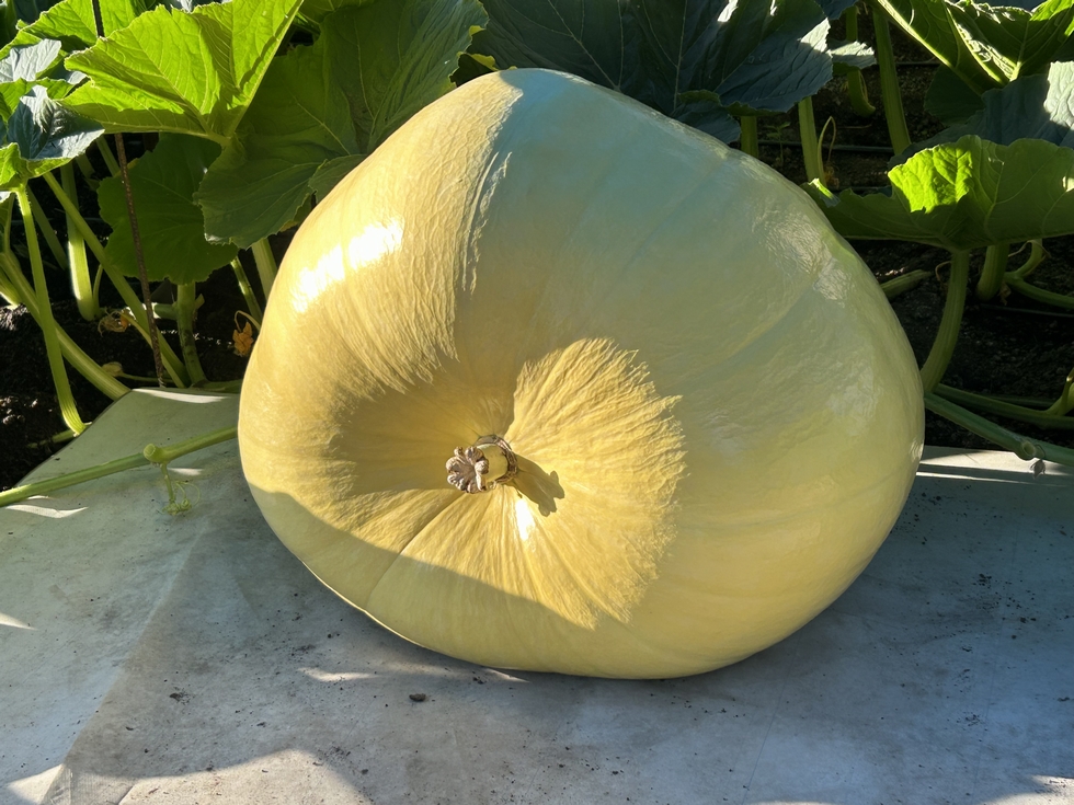 This is my 1300 Gienger fruit. Its guardian frog likes to hang out on the pumpkin's stem. This fruit hit day 25 today. Although its day 25 measurements are not as big as the frogless monsters growing in my greenhouse, it is much bigger than my 1686 Stelts (which grew my 1940 last year) was on day 25! There is a lot of time for this fruit to grow & for its frog to keep it company & provide it with good luck.
