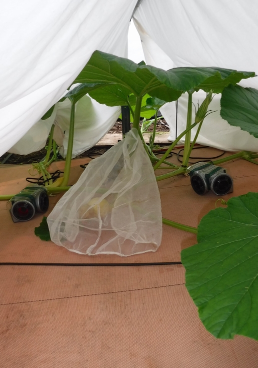When the entire season is based on basically one pumpkin everything is done to increase the odds of a successful pollination. So, not only is there a double layer of mill fabric, followed by �� plywood then another double layer of mill fabric under the pumpkin but there is also a white sheet over the site and the pumpkin has a 5-gallon paint strainer bag over it. The mesh of the paint strainer bag offer good air circulation and also some additional shade. In addition, there was a bird that somehow got into the hoop house so this just provides another physical line of defense for the random and unexpected circumstance that may occur.