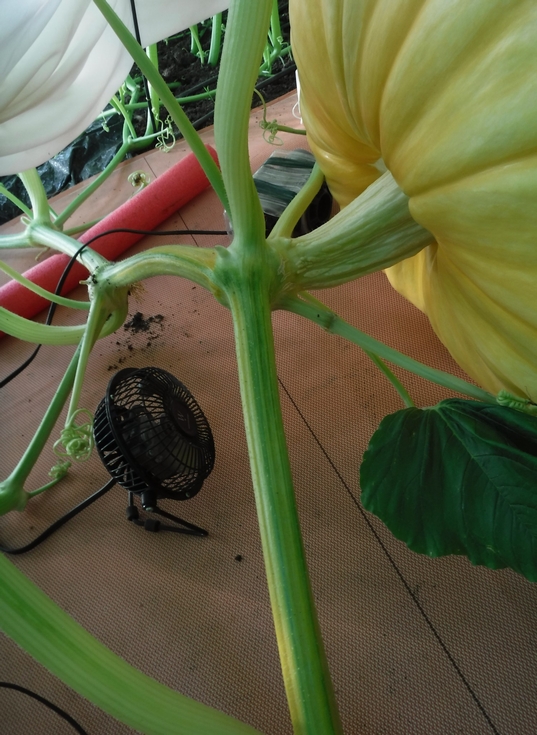The positioning of the pumpkin in the near center of the plywood is also helpful for later in the season. It allows a firm and flat surface for the fan and helps eliminate the chance of soil contact with the pumpkin. Overall, it just helps maintain a clean area around the pumpkin.