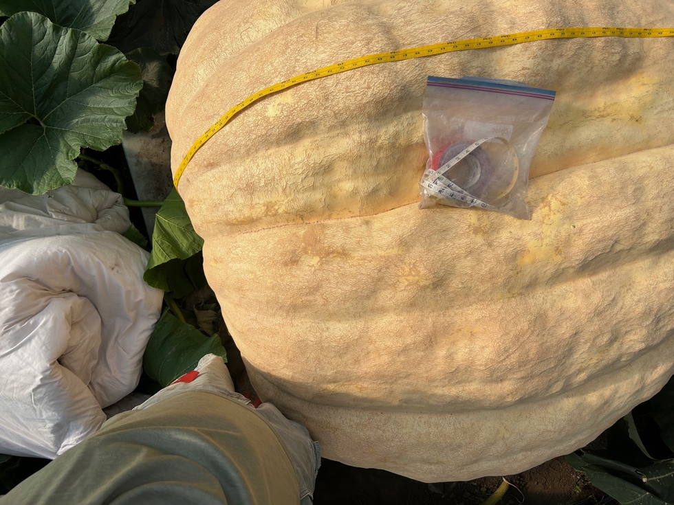 Charlie Bernstrom just texted me & asked how The Slunger is doing? I guess I've been neglecting my Slunger updates, probably because I can't get a picture that really does it justice. It isn't tall & photogenic like Cole Hocker the Pumpkin. The Slunger is white with a greenish tinge & is about six feet wide & six feet long. Its overall shape reminds me of an aircraft carrier. My friend Kirk Mombert (2 time Half Moon Bay winner from back in the 1990's) says it is going to outweigh Cole Hocker by a mile. I guess they used to weigh pumpkins in mileage back then. This pic might give you some idea of how big it is. I'm standing next to it taking the pic with my phone reaching as high above it as possible & this is all that fits in the frame. Yes, The Slunger is a bad a$$ pumpkin. I think it will finish out at about 490� & will be about 13% heavy. I'm afraid to even put those numbers into the OTT calculator. That's the latest on The Slunger.