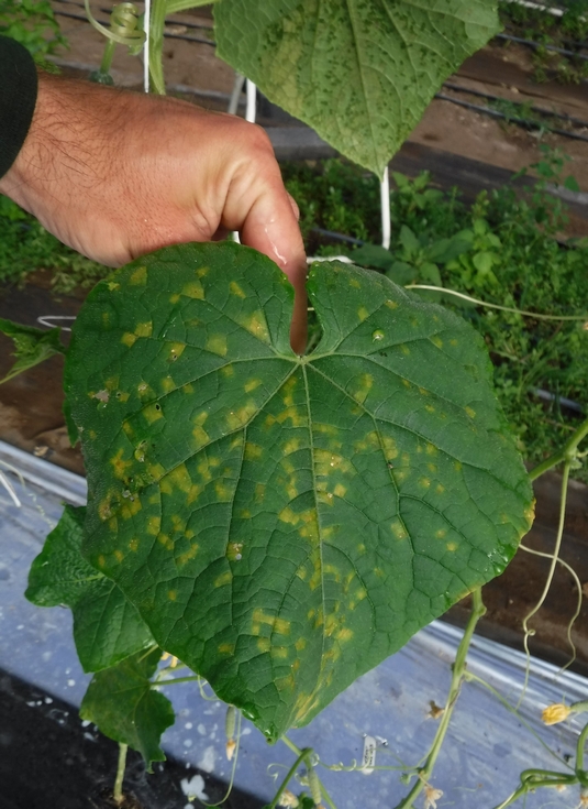 Pictured is Downy Mildew in Cucumber which is a key disease of concern.