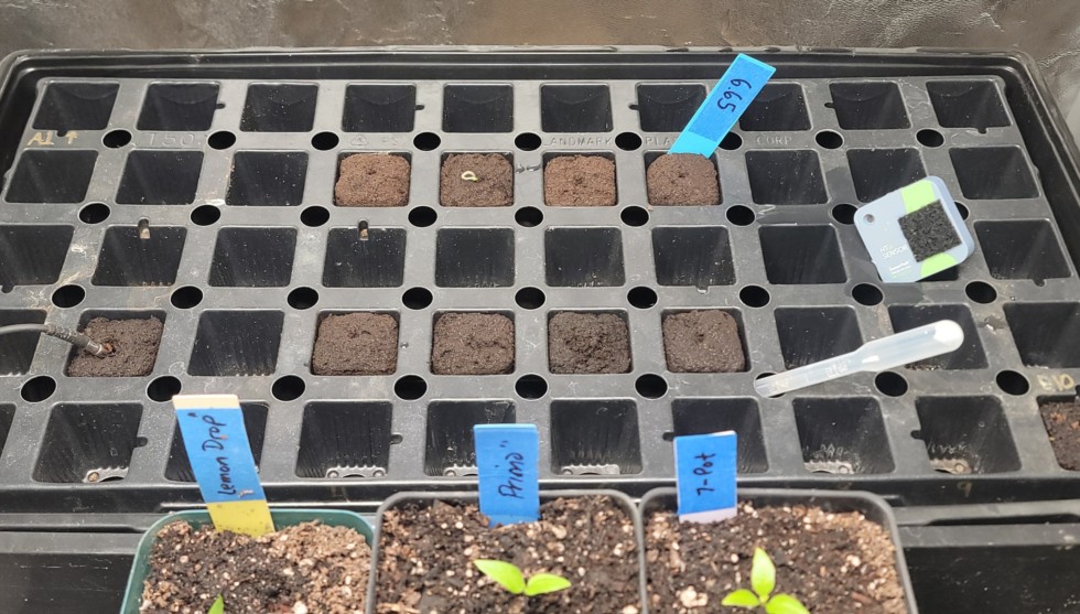 These are the eight 6.65 Greene's nestled into Root Riot plugs. As you can see, one of them popped after 36 hours. I obsessively peek & was very surprised to see this emerge so early. Never seen a Domingo so aggressive. Wondering if a crazy fast germ translates to a more aggressive mature plant & fruit.