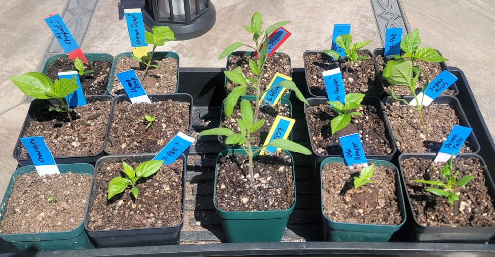 Needed to make room in the grow tent for my tomato competition seedlings, so these are all moving out back for hardening. These are the super-hots and three of my 6.65 Greene's used to test the germ chamber.