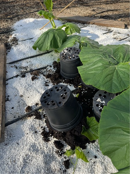 We sweep our side vines back gradually to make room for the pumpkins
