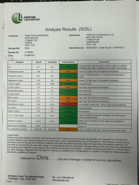 This is our latest soil sample and another has already gone. You can see that the nitrogen is higher than we would like but it's extremely difficult to get perfect. We normally rely on our past experience and reading our plants.