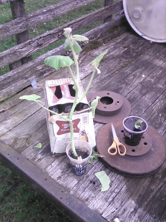 That same 113 seedling as of 5-19-25, so, about a month along already; It has had a tough-butt-cushy life so far and its leaves trimmed for ease of planting just now. I had added more SS Mix to it at some recent point since it was headed out to here - Surprising what it grew into on like 1 inch of SS Mix in a 16 oz. cup w. MG Tomato food and Myco in it and reused. eg