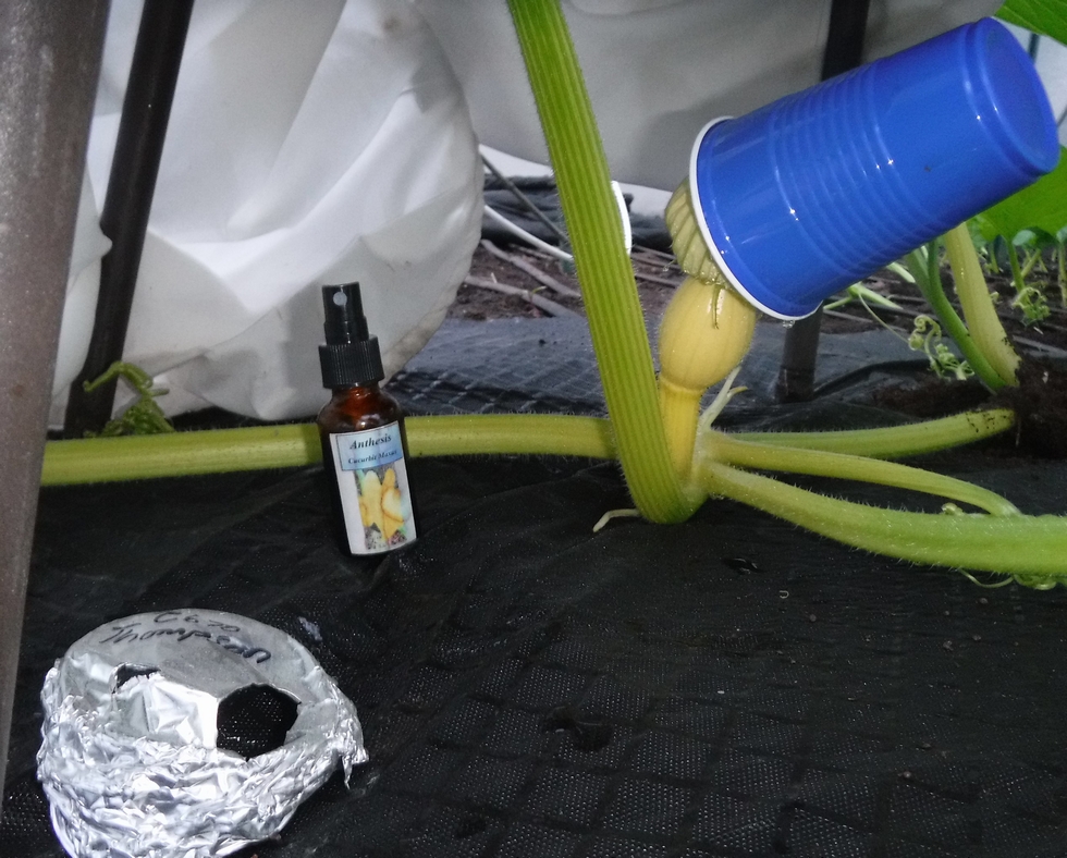 This is a critical time in regards to cell division so the hormone application "Anthesis" has been made in hopes of prolonging the duration while also increasing the rate of cell division. There are two hormones in this mix as each one has a specific purpose and concentration that is needed. This application may result in the pumpkin being smaller in the short term, but the goal is for longer term gains.