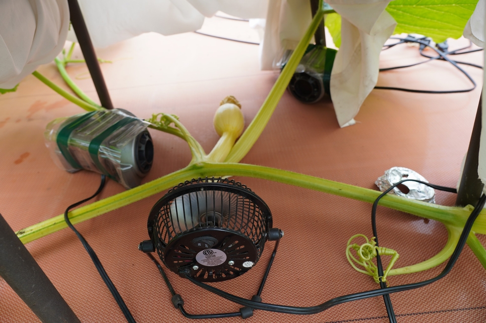 Here is a different view of the pumpkin, fan and sonicator set-up. The main vine has a slight bend to it, but a few nodes down is the back-up so this bend should be sufficient to keep it away from the pumpkin. Also, since everything is on the double layer of mill fabric adjustments will hopefully be easy to make as the season progresses if necessary.