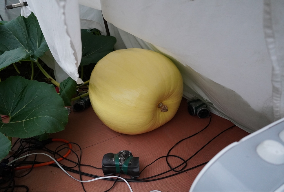 It is still early in the season, but so far the shape is staying very symmetrical and the pumpkin still has a nice shine to it. A box fan has been added at the blossom end and an extra sonicator to ensure full coverage around the entire pumpkin to deter mice from investigating this area.