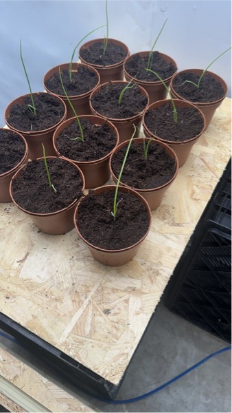 12 onions potted with the third leaf just showing.