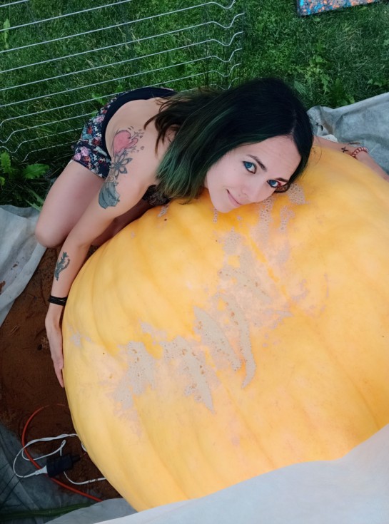 July. The weather improved. It still rained, but it got warmer. I really wanted my pumpkin to be orange, and in July it became clear it definitely wouldn't be white. It would be orange. I went on a short vacation. My brother and his wife watered Gorky Park while I was away. When I returned, the pumpkin was already 184 kg (DAP 44). 100 kg in a week - for me, that was still something incredible. The orange color turned�a beautiful�shade�of�pink. It was a very beautiful color, like a peach. Finally, normal summer weather arrived, with temperatures around +28�C. This contributed to good growth. At DAP 50, the pumpkin was 250 kg. The color of the pumpkin became more and more beautiful; people started saying that they wanted seeds from my pumpkin. It was very nice to hear. At DAP 60, the pumpkin was 311 kg. Although at that age it should have been growing more slowly, it grew well. I constantly had to redo the shelter from rain and sun because it needed to be made bigger and bigger.