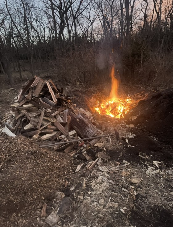 Bio Char has been a fun winter effort. Chopped ~cord of wood, dug a 3x6x10 pit, and got the fire started at the bottom of pit with a small amount of the wood.