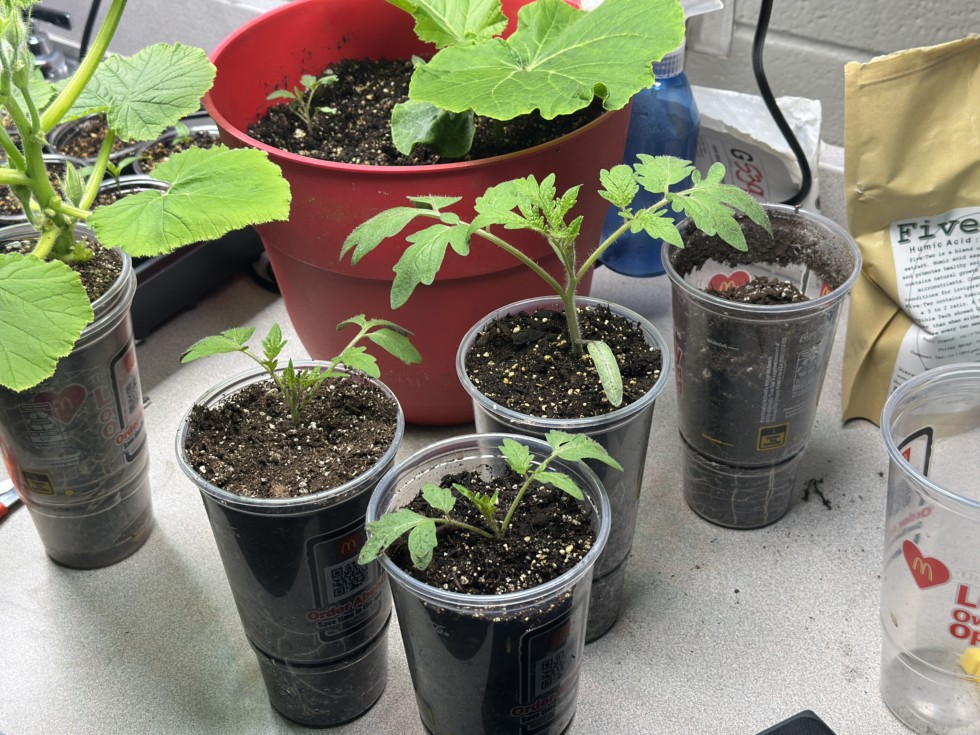 Significant size difference in the 4 tomato plants in this picture. As part of an experiment, these are all the same seed and planted at the same time. The difference is the cups in which they were started. There is 100% no denying that size matters; container size that is. I already knew what the outcome of the experiment would be, but I wanted to prove it to myself.