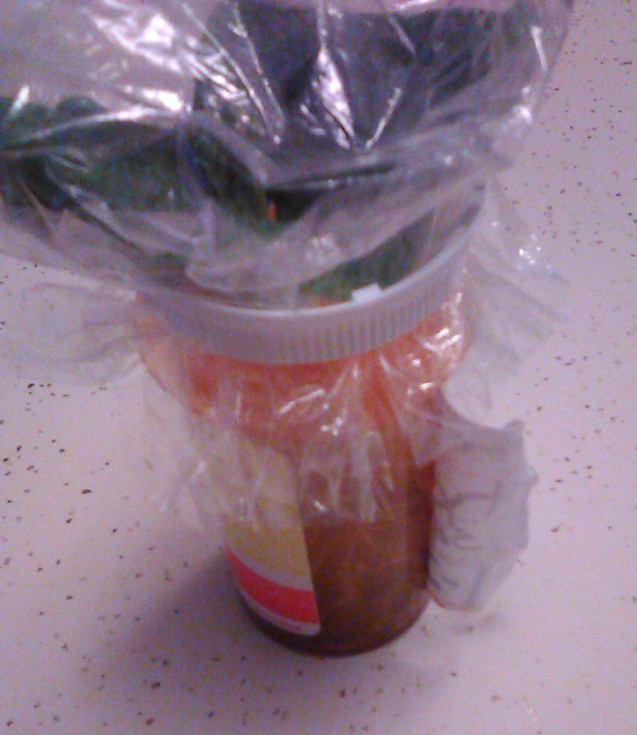 A few days later, having probably been in 'The Dark Room' (a linen closet) a day or 2 at a time to initiate rapid stem elongation, where the 'balloon top' is allowing the leaves to expand and please NOTE the label having been started to be peeled away, slowly, by fingernail. eg