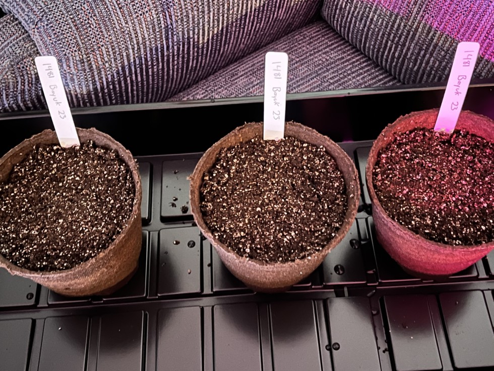 Starting three seeds from the 1481 Bayuk 23 in 5" peat pots that were moistened with holes, parked in the sides beforehand. Planted in Black Gold seed starting mix inoculated with mycorrhizal. Moisten the potting mix with the remaining seaweed solution that the seeds were soaked in for a couple of hours. On a heat mat set to 85°F.