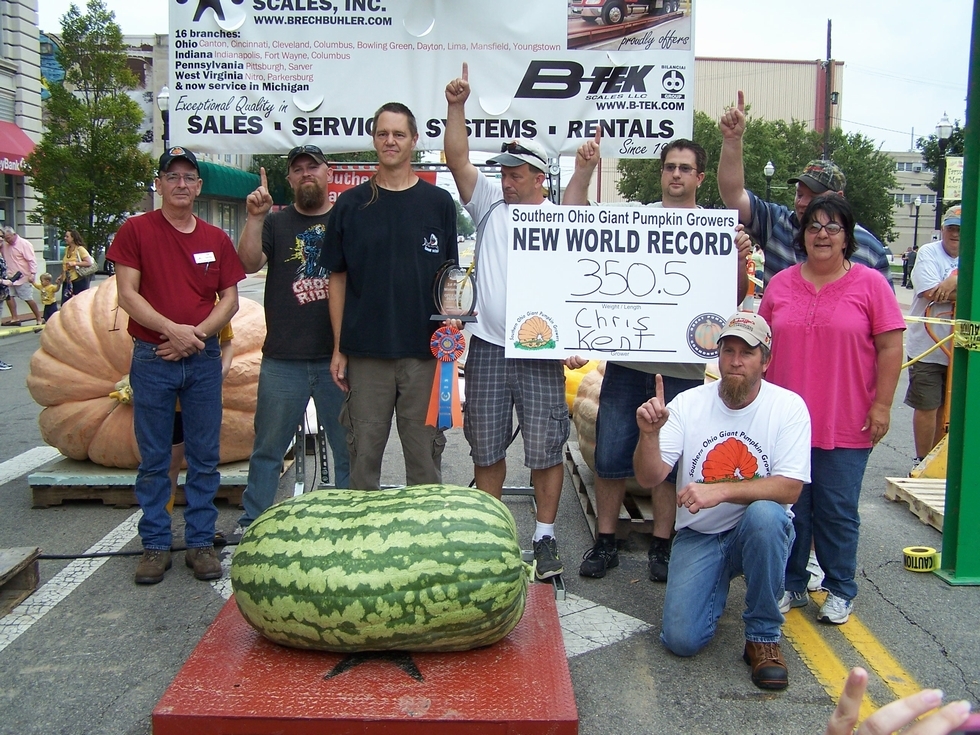BigPumpkins.com congratulates Chris Kent on his 350.5 pound watermelon weighed at the SOGPG GPC weigh-off in Hamilton, Ohio on October 4, 2013 during the Operation Pumpkin festival. Chris grew this new world record watermelon on his 291 Kent seed and crossed it with his 274 Kent.