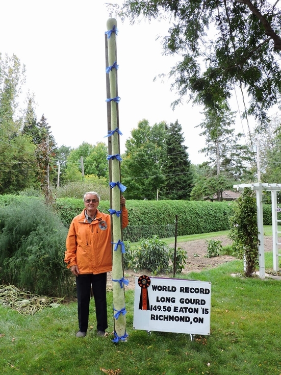 BigPumpkins.com congratulates Al Eaton on his 149.50 inch long gourd measureed at the Bracebridge Agriculture Society Fall Fair/Horse Show. Al grew his record long gourd on the 139.25 Ansems 2013 seed and crossed it with his own 122.88 Eaton 2012.