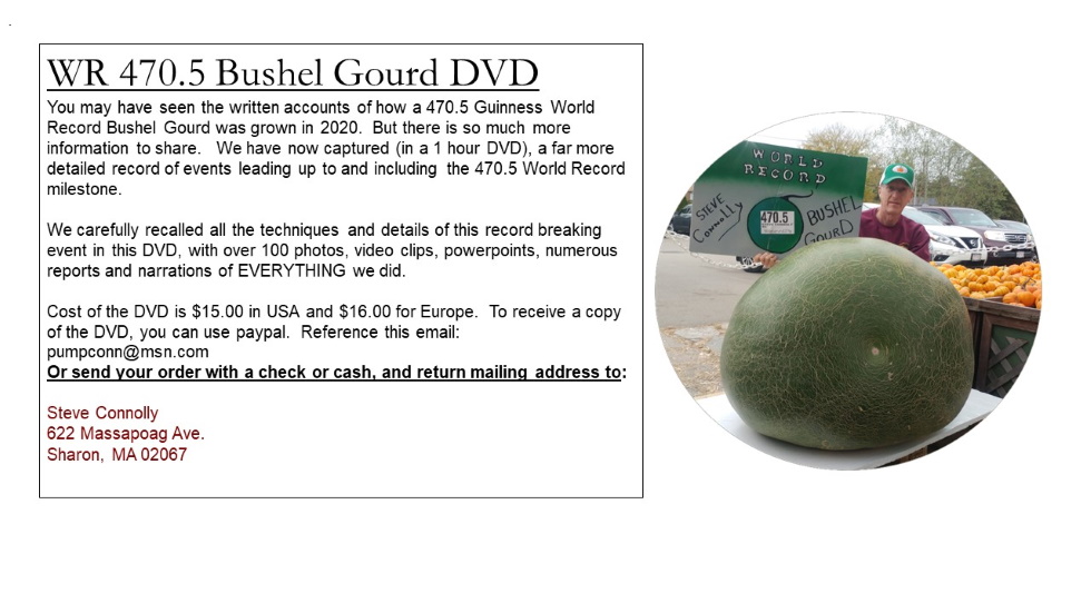 BigPumpkins.com congratulates Steve Connolly on his 470.5 pound bushel gourd grown in Sharon, MA. Steve grew his world record bushel gourd on his own 320 Connolly seed and it was self pollinated. Be sure and check out