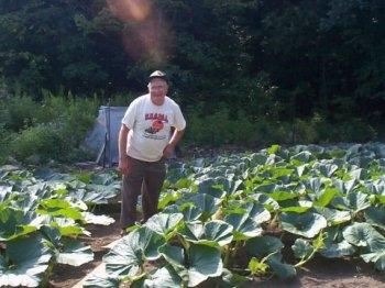 The second stop of the N.H.G.P.G.A. patch tour was at Jim Kuhn's house in Goffstown, NH. Jim is the current New England champion having grown a 929.2 pound pumpkin in 1997. This is a shot of Jim with his 801.5 Stelts plant. The 801.5 comes from the 825.5 Shymanski 1996 crossed with the 562 Rose 1995. This is a very popular seed this year and is therefore very hard to get your hands on!