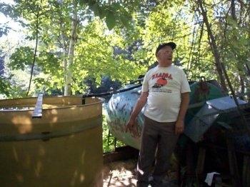 Here Jim is showing us the tanks for his watering system. These tanks feed the drip hoses throughout Jim's garden.